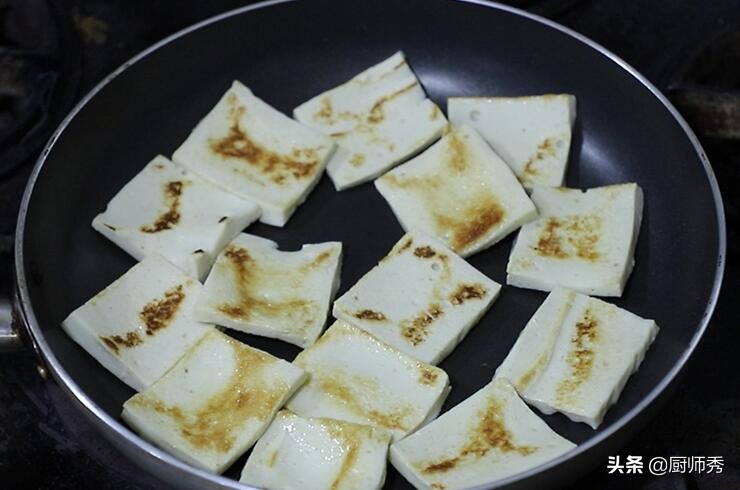 2、下面开始上火煎豆腐,锅烧热之后下少许的植物油。油润下锅,然后下入千叶豆腐煎制,把豆腐一片片的排列开,煎制的时候控制好火候,火力不要太大,防止糊锅,并不断的转动下,在煎制中间要不断的淋油,这样煎制出来的豆腐才金黄。