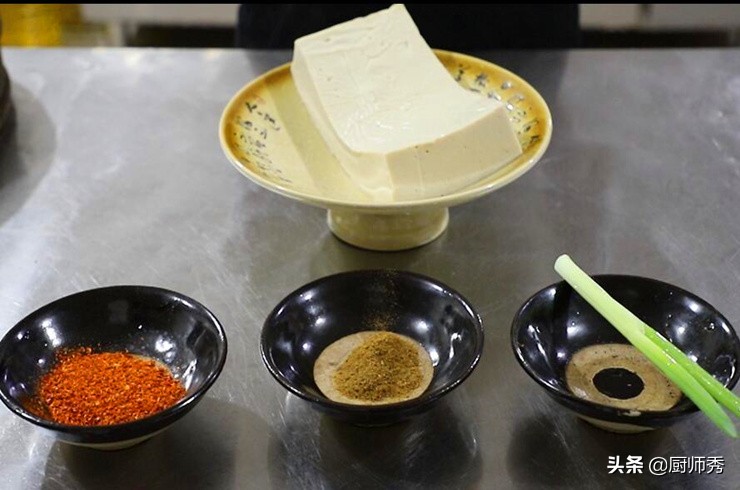 千叶豆腐比较嫩,煎的时候容易膨胀,锅内不要放的太满,适当的预留一点空隙、辣椒粉不要选用太辣的,推荐秦椒加河南新一代混合使用,辣椒粉要粗一点,最后加辣椒油能增加成菜的颜色和增香。