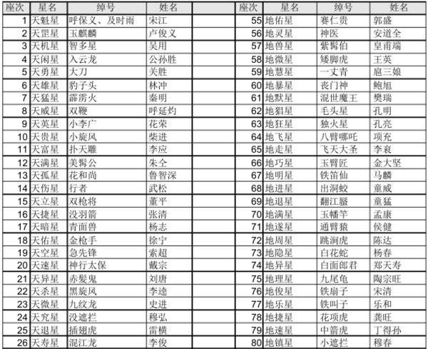 水浒传梁山好汉一百单八将名单座次,绰号与结局