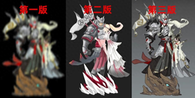 在官宣出场之前,也曾经有三版爆料,第一版本中,打满了马赛克,糊的连亲妈都不认识,不知道的还以为是杨戬的京剧扮相呢,第二版本很粗糙,色调略显轻浮,莫邪更像是挂件一样挂在干将身上。第三版配色厚重了许多,可莫邪矮的,像是小朋友一样,当时有网友还疯狂吐槽:爸爸妈妈去上班,我去幼儿园。