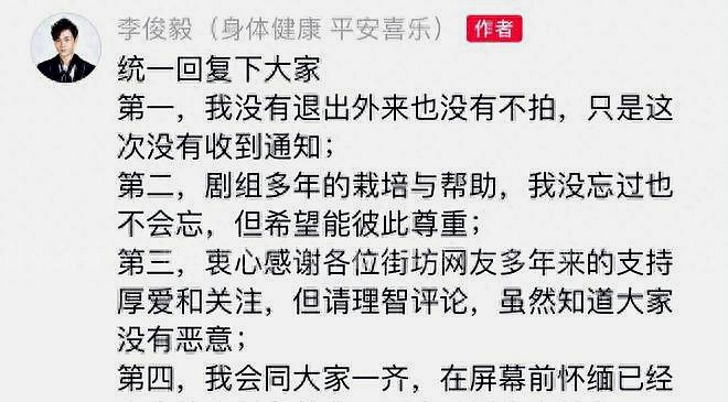 李俊毅表示,非常感激剧组多年来的培养与帮助,但自己之所以缺席是因为未得到通知。然而,他的一句“希望能够彼此尊重”引发了网友各种不同的猜测,有人认为他与剧组存在芥蒂。