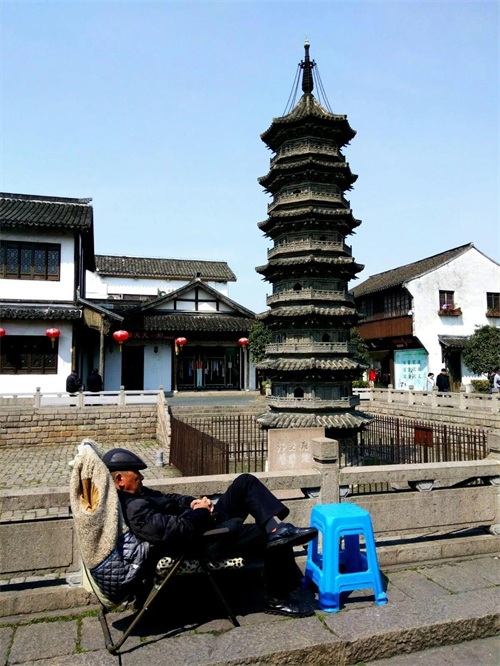 静默矗立的千年古塔,晒着太阳睡午觉的老街居民,很温暖,很温馨的一幅画面。