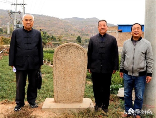 杨沉老师(右二)、杨正武(左一)与杨沉老师的儿子在石碑前留影