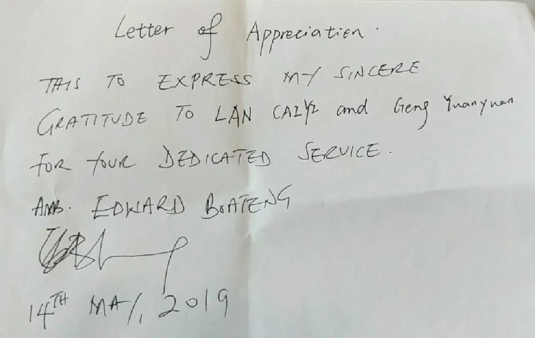 2019年5月14日,加纳共和国驻华大使在广州乘机时书赞东航广东分公司地面服务人员。他写道,“谨以此信,向蓝彩怡和耿媛媛专业的服务表示真诚的感谢!”“I would lead you to the counter of CHINA EASTERN AIRLINE for ticket changing.”专业英语八级的蓝彩怡引导驻华大使来到东航柜台。耿媛媛核对证件信息后,为乘客办理机票改签手续。