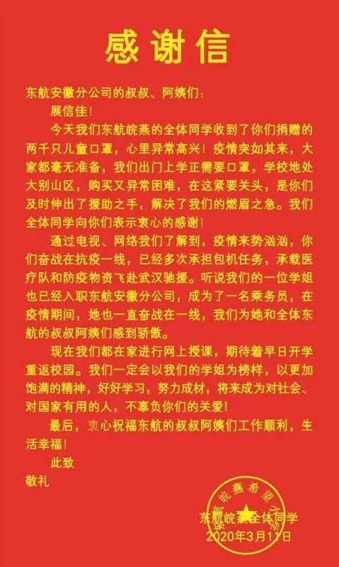 疫情期间,东航安徽分公司了解到,金寨东航皖燕希望小学防疫物资储备不足,遂于2020年3月4日将公司库存中2000只儿童口罩无偿捐助给学校。3月11日,在收到口罩后,学校负责人以全校学生的名义向东航安徽分公司送来一封感谢信。