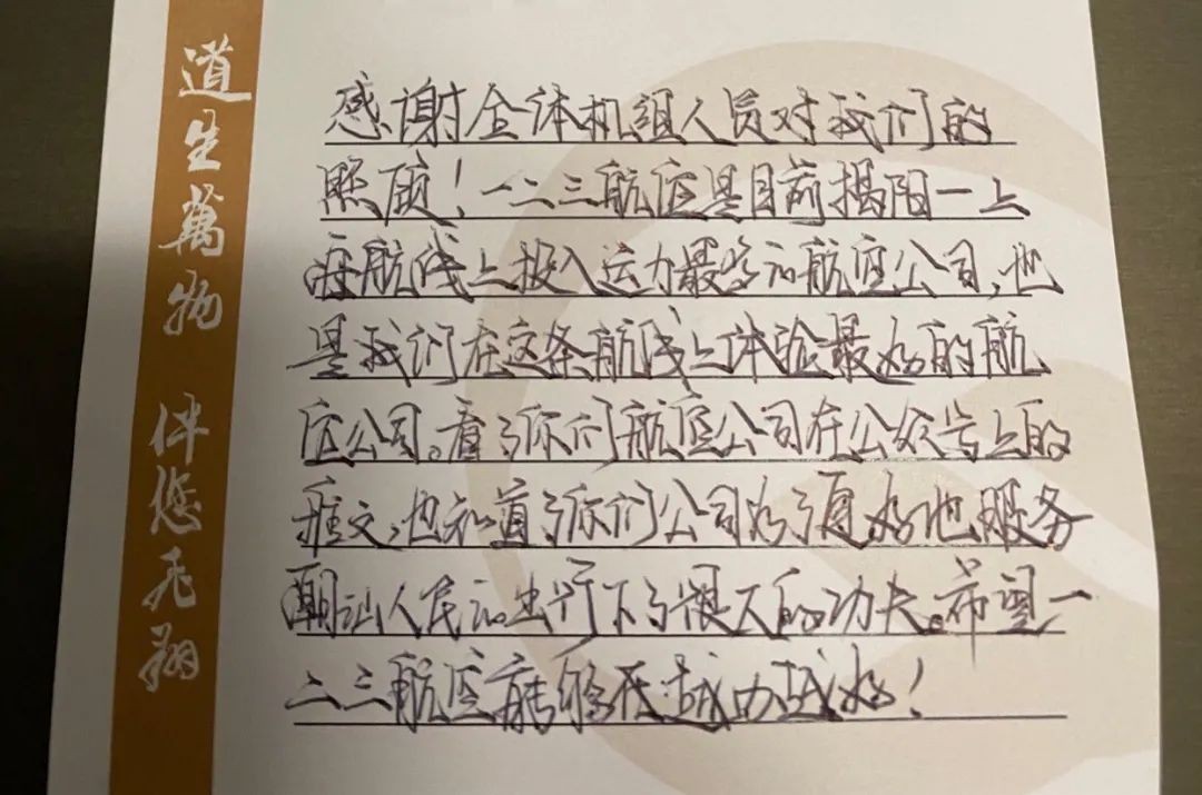航班上,旅客吴女士带着女儿乘坐MU9069上海飞往潮汕的航班,当乘务员得知吴女士是一名航空爱好者,同时当天恰巧是吴女士女儿的生日时,当即贴心地送上生日贺卡,并为她唱起了生日歌。这令吴女士非常感动,并写下了这封感谢信。