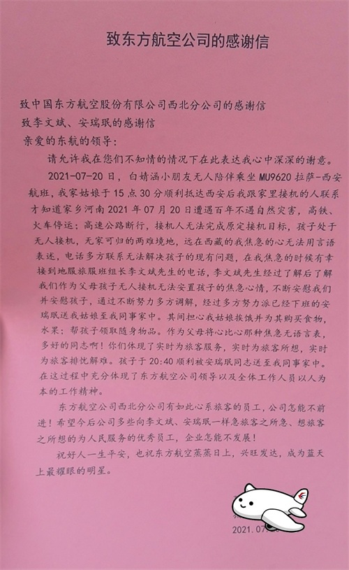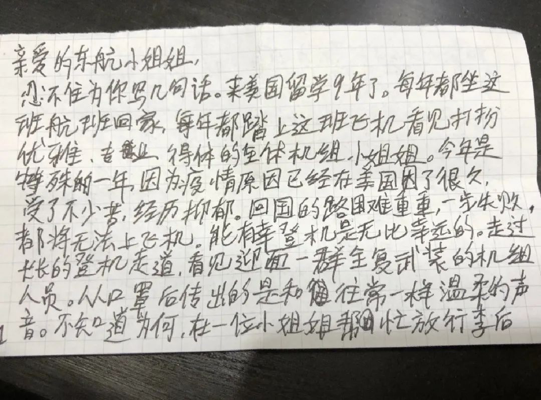 “东航人在整个过程中奔跑的背影、挥洒的汗水以及细致耐心的态度深深感动了我们,特此向全体东航工作人员致以最衷心的感谢!”朱建军医生在信中如是写道。