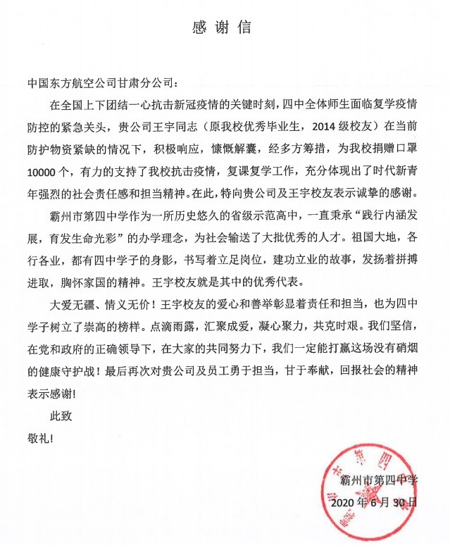 疫情期间,甘肃分公司安全员王宇心系家乡,心系母校,托朋友从厂家购买了质量上乘、品质保障的一万只防疫口罩,寄给了高中班主任郭运涛,为母校——河北省霸州市第四中学捐赠一万只口罩。