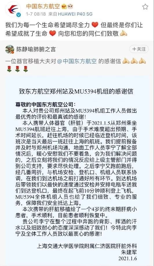 2021年1月6日,朱建军医生携带捐献器官赶往机场,由于临近登机时间,而东航的MU5394是当天最后一班飞往上海的航班,地面工作人员了解情况后,全力保障朱医生一行人快速通过安检,顺利登机。