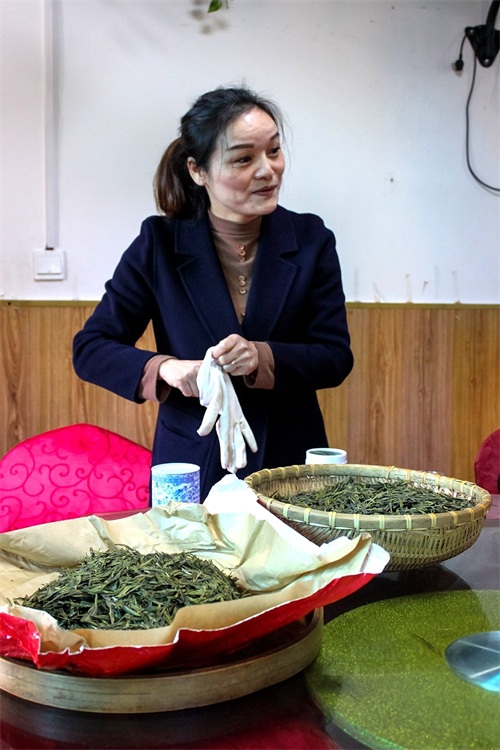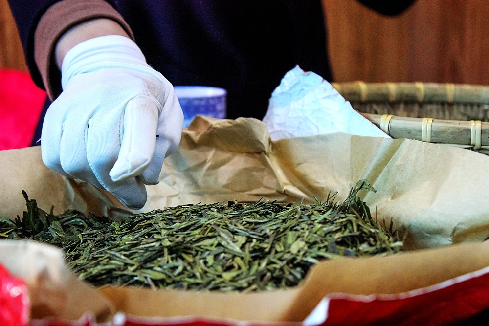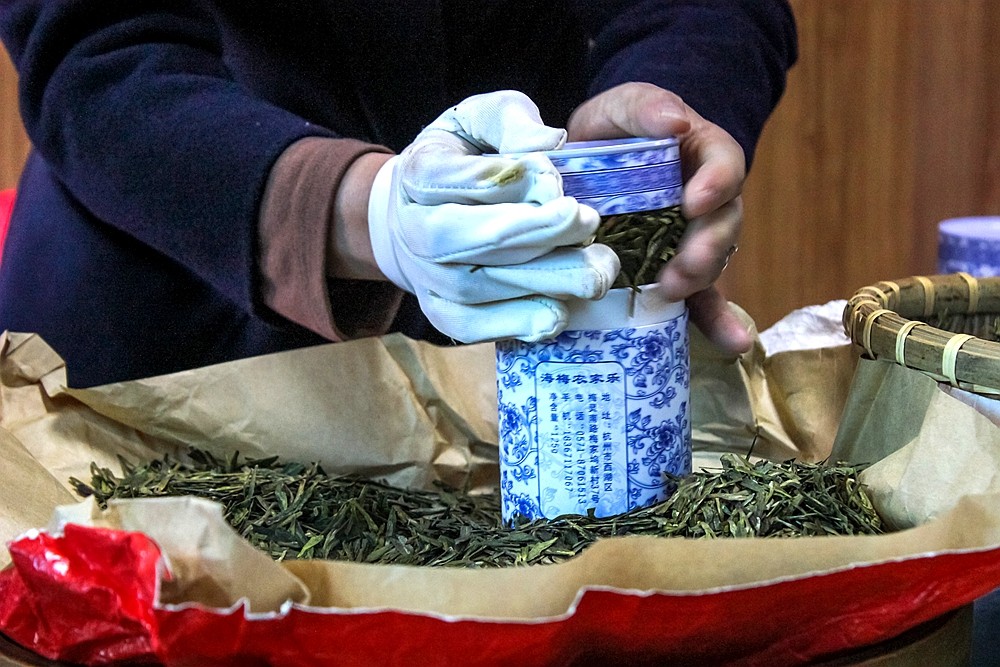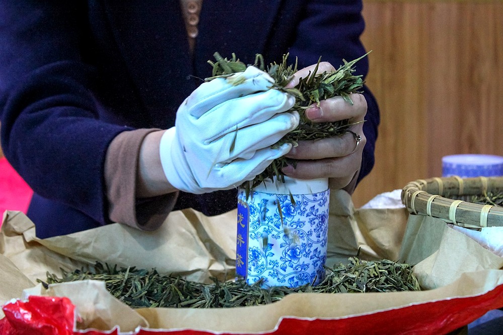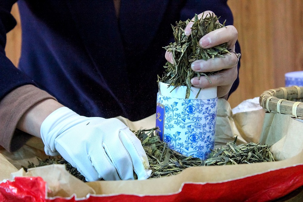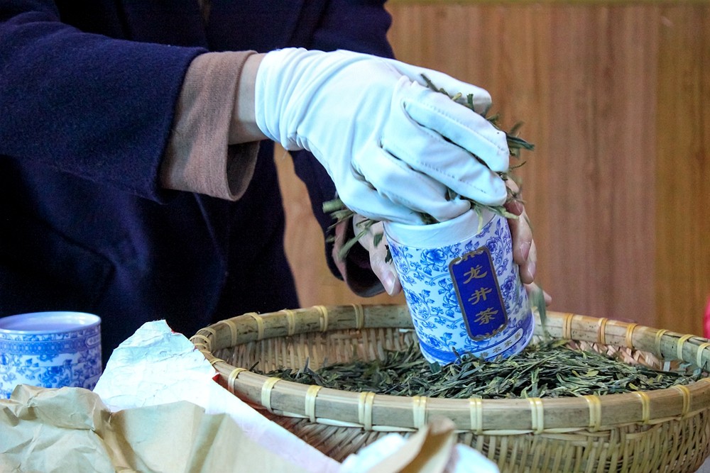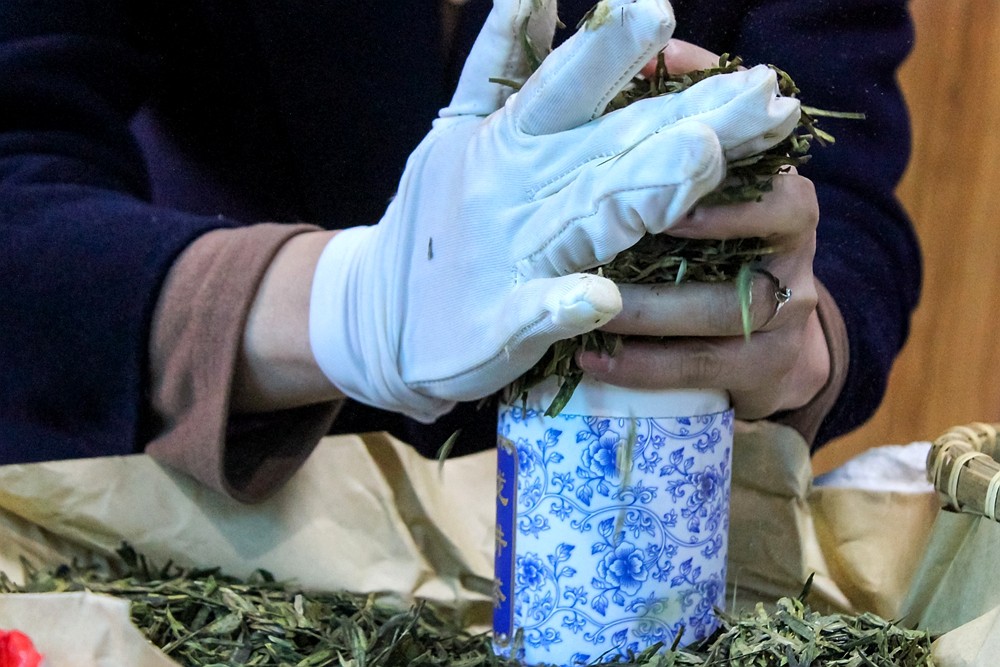 茶农大姐为我们演示如何在罐装龙井茶。首先,在抓取茶叶的时候,一定要避免手上有化妆品、香皂等味道。这些杂味极易被茶叶吸附,从而影响茶叶本身的味道,抓取茶叶之前要用清水清洗手并擦干净,而且,抓茶叶的手必须戴上手套。