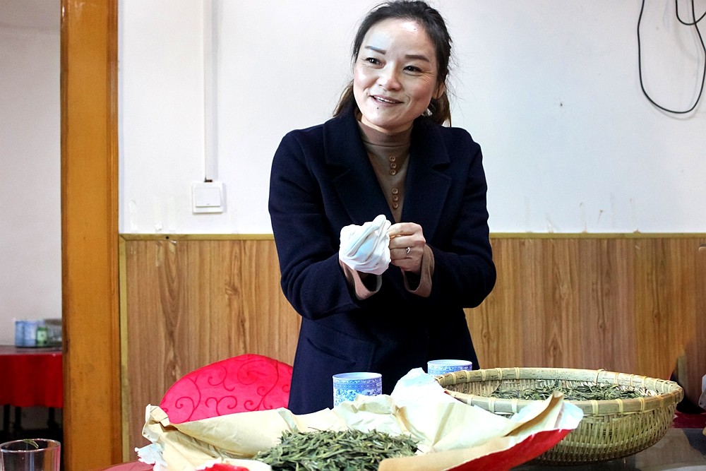 茶农大姐说,龙井茶茶片外形挺直扁平,装龙井茶不能横着放入,一是容易折断,二是罐内放入的量少。