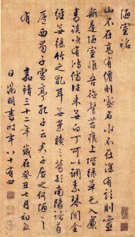 本幅作者署款:“嘉靖三十二年岁在癸丑七月初五日,徵明书,时年八十有四。”说明这是文徵明84岁时所作的行书,其用笔沉稳含蓄,人书俱老,飘逸绝尘,堪称是古代行草精品中的精品,代表着行草书法的巅峰水平,令人爱不释手。所书内容与原文略有出入,当是文徵明默写致误。