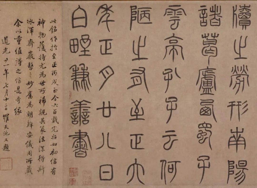 泰不华篆书作品欣赏《陋室铭》卷,纸本,纵36.9cm,横113.5cm。作者时年43岁,其书法兼善篆、隶、楷。篆法师宋徐铉,下笔多用方折,行笔圆活遒劲,结构疏朗工稳,末笔多作尖锋,即“悬针”笔法。此为迄今所见泰不华唯一的篆书真迹。作为一个少数民族文人,能写如此齐整秀逸的汉字古体,实属难能可贵,
