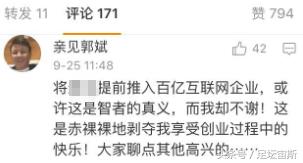 实际上,在9月份,郭斌就曾在漫天的辱骂中一笔带过却不无自豪地宣称自己的创业项目估值达到11位数,也就是百亿估价。“不屑一顾就眼不见为净,xx(注:隐去创业项目名字,下同)在智者的关注漫骂中估值已经上升至11位数,做为董事长,我请求把我当个笑话,都脑残了,过过瘾就得了,翻篇了吧!让我们快乐大家庭的伙伴们留下一片分享快乐的净土。将xx提前推入百亿互联网企业,或许这是智者的真义,而我却不谢!这是赤裸裸地剥夺我享受创业过程中的快乐!大家聊点其他高兴的。”
