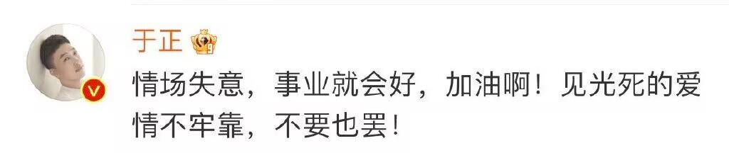 对此,于正还去汪汐潮微博下留言:" 情场失意,事业就会好,加油啊!见光死的爱情不牢靠,不要也罢!" 言语犀利。网友也感叹,难道明星谈恋爱就这么难?