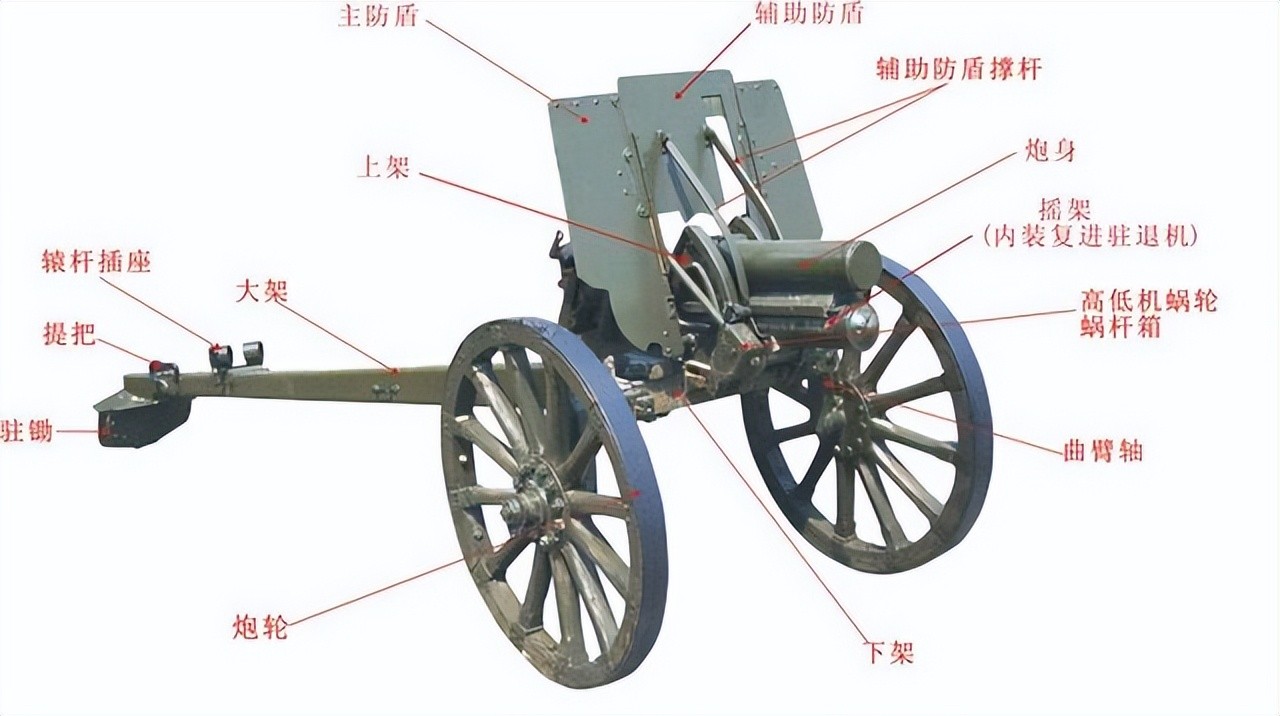 取掉炮盾的九二步兵炮,此时处于大仰角状态