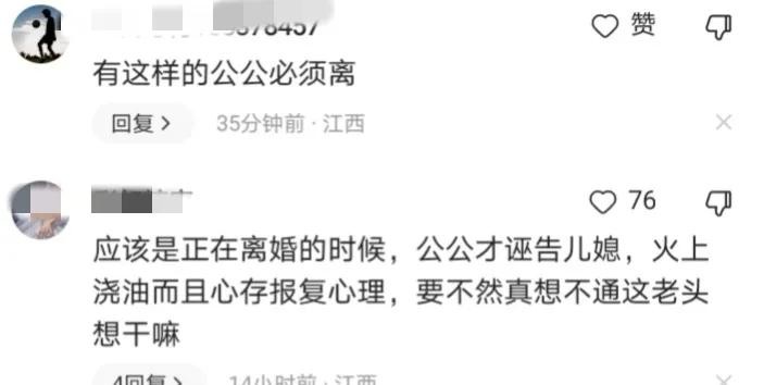 这样的局面,也不禁让人产生疑问:这公公到底跟儿媳有啥“过节”?