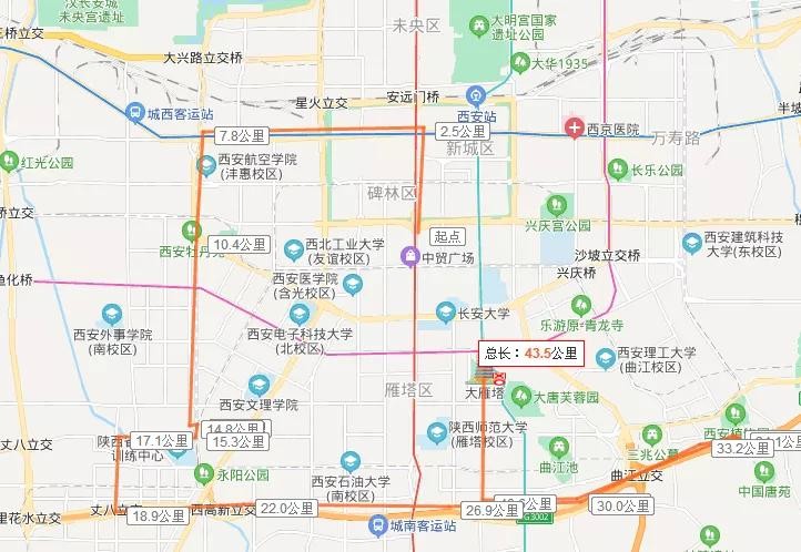 起点依然是南门广场,然后一路向北,过钟楼到北大街十字向西转向,沿莲湖路出玉祥门,继续沿大庆路到西二环转而向南,沿西二环一路向南,在西南二环转角处从唐延路进入高新区,在唐城墙遗址公园的一路陪伴下向着南山奔跑,到丈八路后稍作绕行进入南三环,继而沿南三环一路向东,在新植物园附近掉头,继续沿南三环折返到雁塔南路,沿雁塔南路一路向北,终点设置到大雁塔南广场。