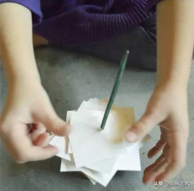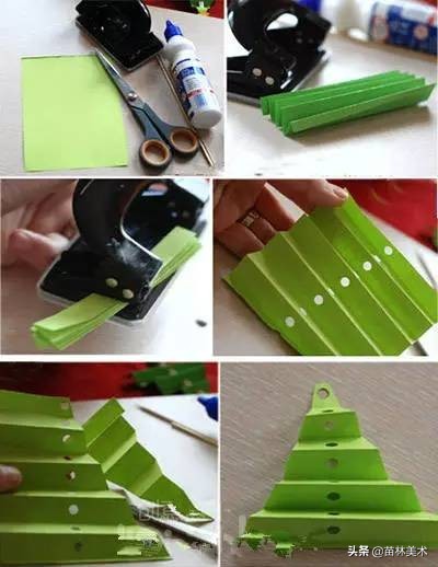 3. 折叠圣诞树,你需要准备绿色卡纸,小木棍(木筷也行)和打孔器。