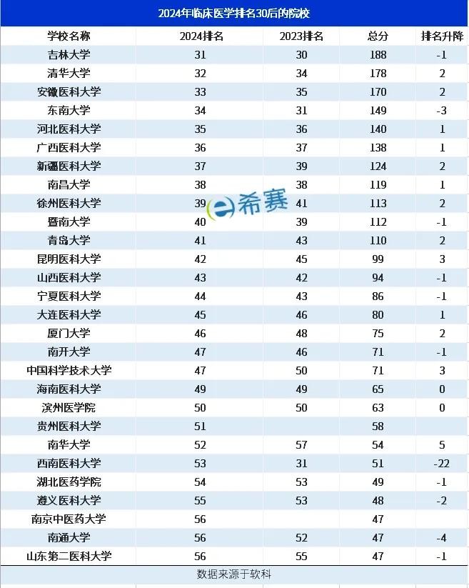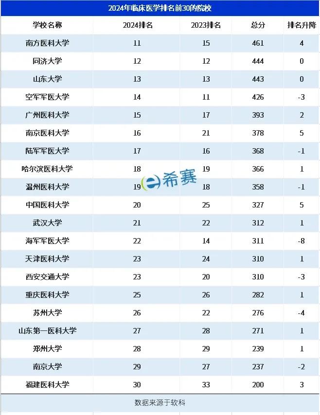 临床医学排名11—30的院校,除了同济大学和山东大学外,其他院校的排名相比2023年都出现了变化。
