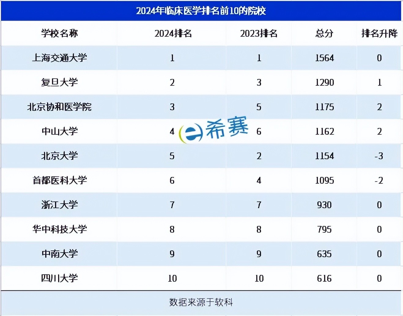 根据排名,临床医学实力前十的院校名单,跟2023年没有变化,不过内部排名却有变。