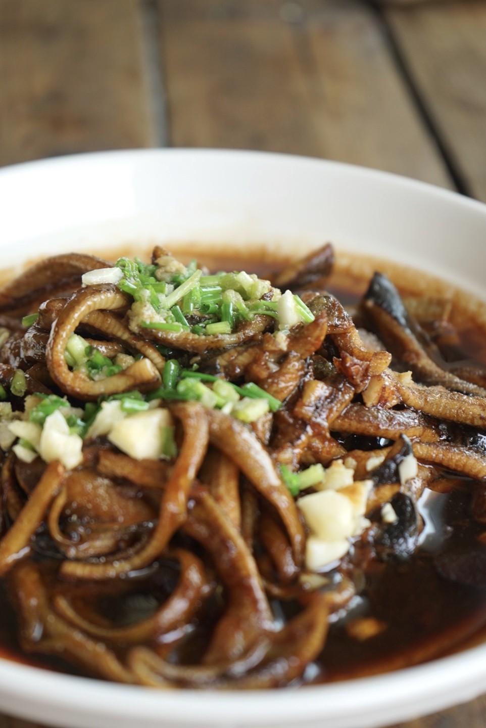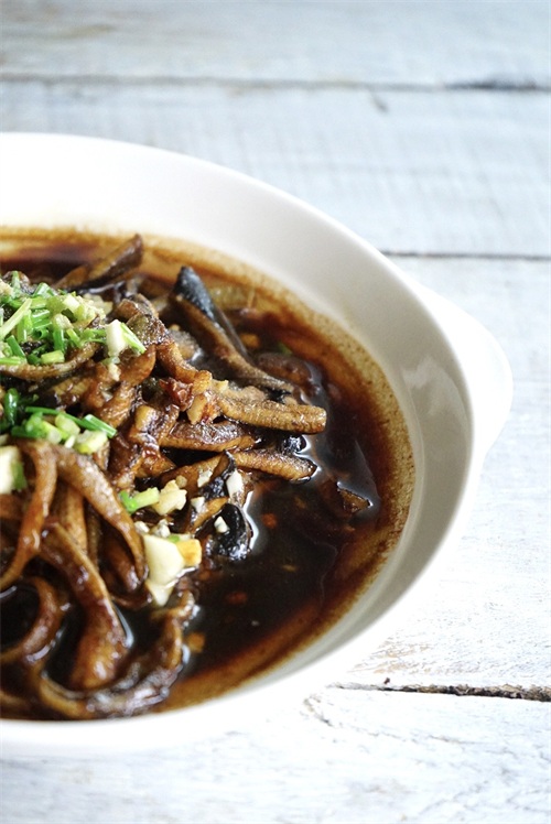 待到汤汁基本已经烧尽,盛出装盘,在鳝丝中央洒上蒜末,葱花,胡椒粉,香油以提香增味。