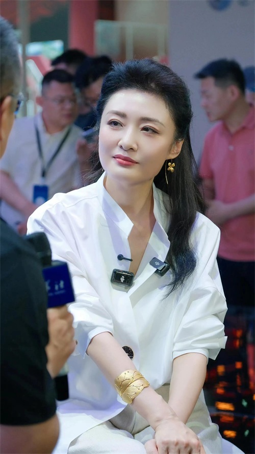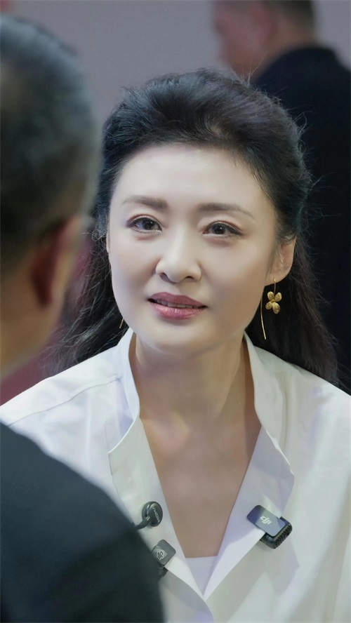 周涛当天穿了一件白色丝绸衬衫,搭配垂感十足的米色阔腿裤,脚踩米色高跟鞋。衬衫袖口微微卷起,领口解开一颗扣子,既干练又不失亲和力。