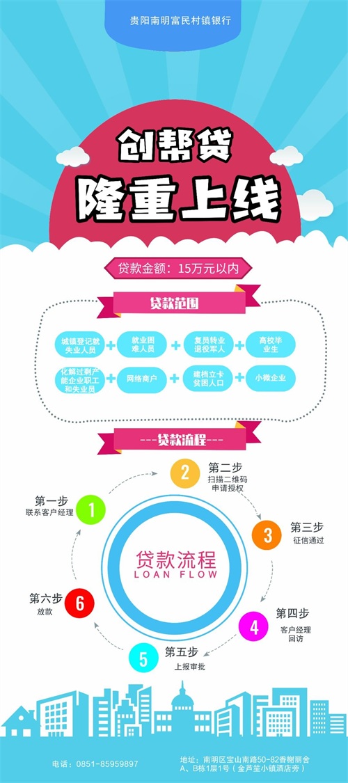“创帮贷”是南明富民村镇银行针对城镇登记就失业人员、就业困难人员、复员转业退役军人、高校毕业生、化解过剩产能企业职工和失业人员、网络商户、建档立卡贫困人口、小微企业推出的一款贷款产品,由政府全额贴息,用于助力有需要的人创业致富,帮助小微企业缓解资金周转困难。