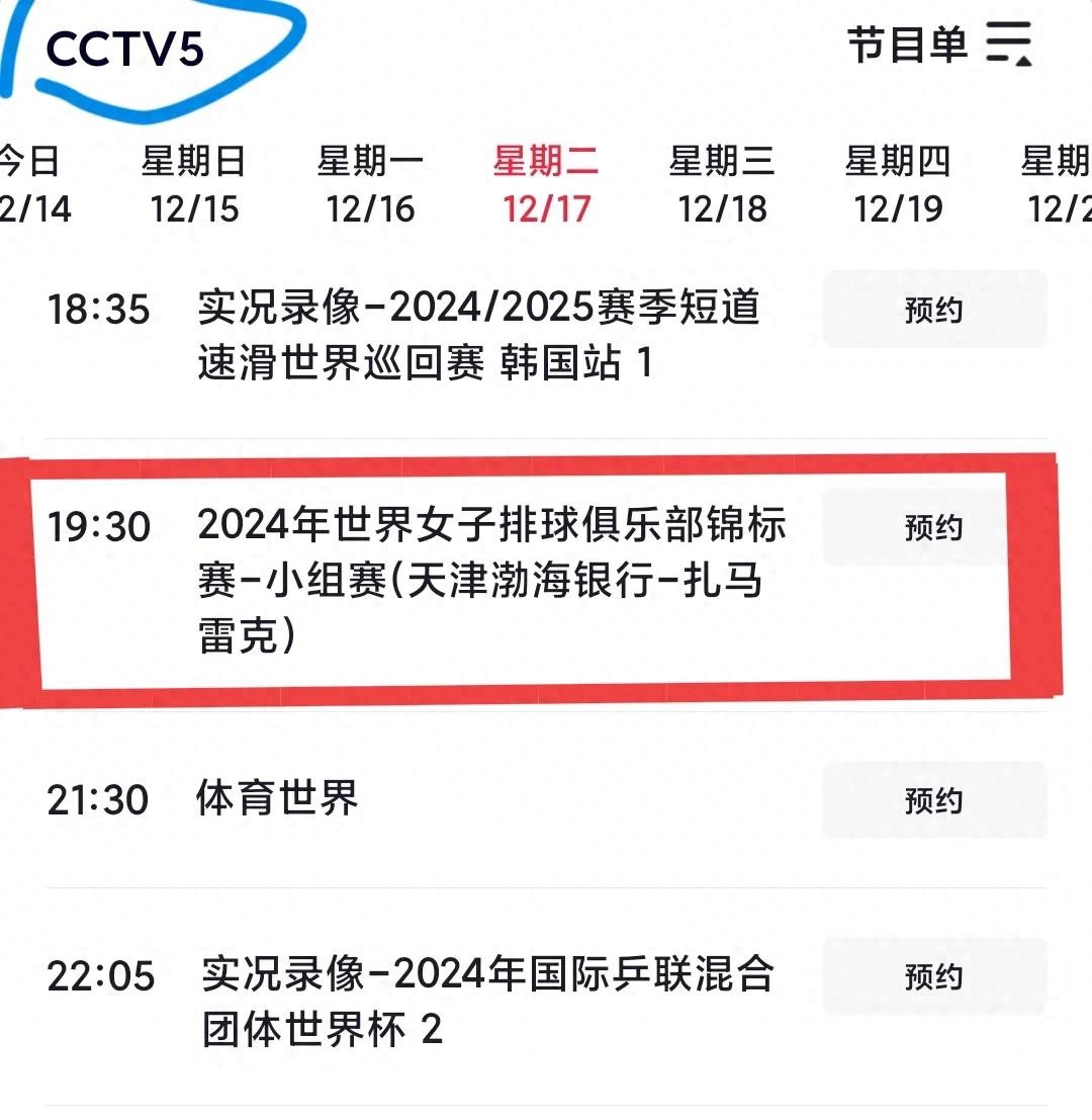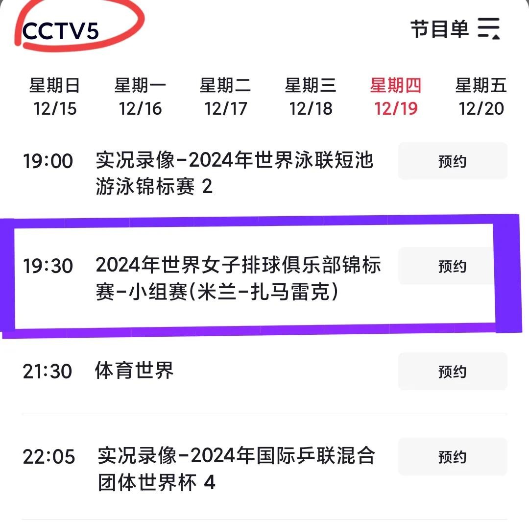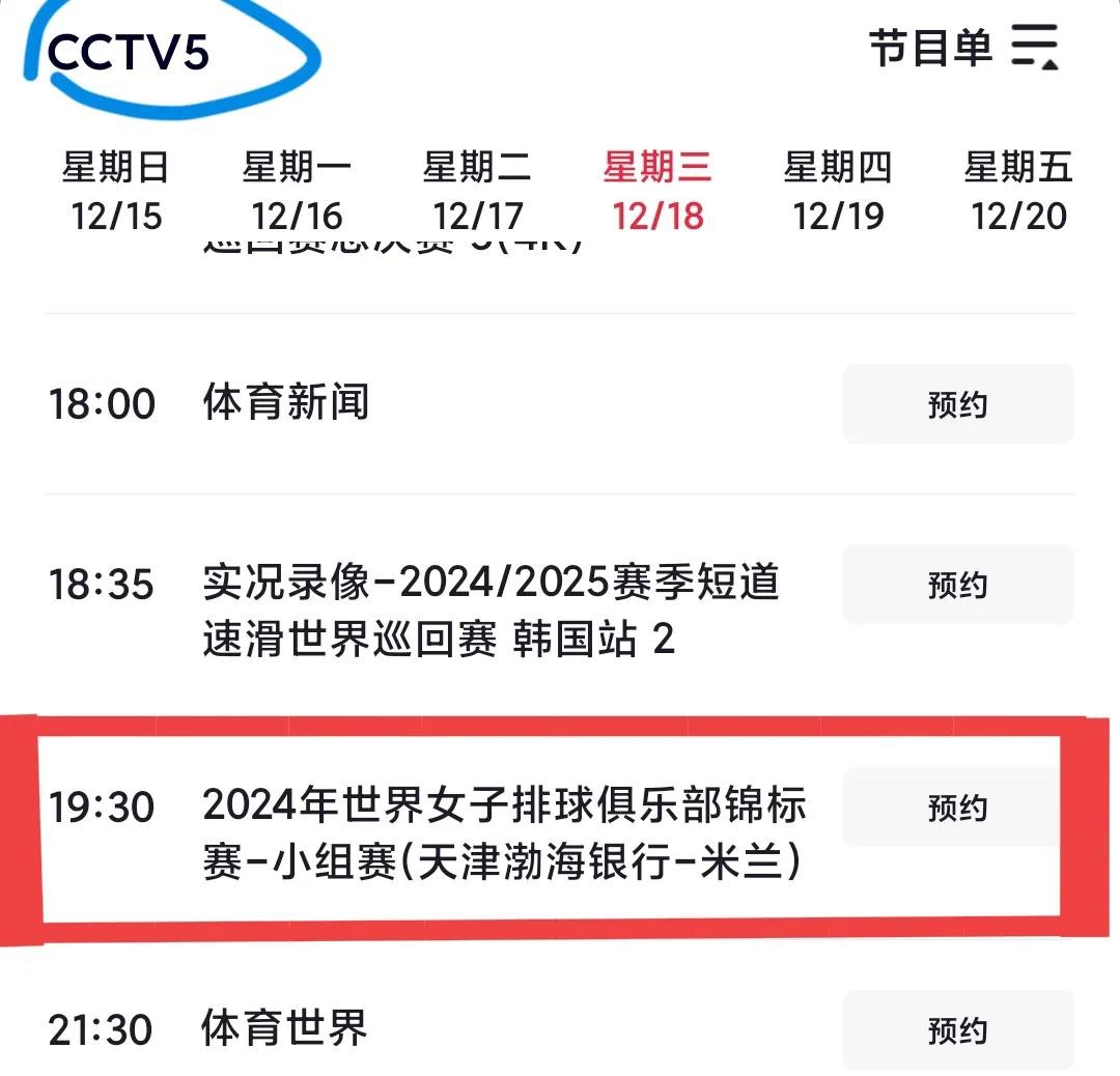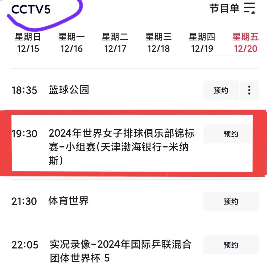 12月19日周四天津女排轮空。晚上19:30,CCTV5仍直播米兰vs埃及女排。