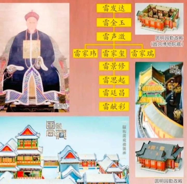 5雷家玺(1764-1825)字国贤,雷声澂次子,样氏雷传人。与兄弟雷家玮在样式房供职,参与修建皇家园林。1792年主持承建万寿山,玉泉山,香山园庭工程及承德避暑山庄。此外,承办宫中年例灯彩及焰火等工程,与其弟雷家瑞领圆明园掌案。1825年去世,享年62岁,赠奉直大夫。