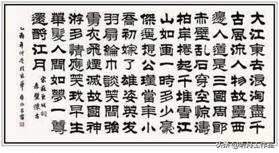 侯德昌写苏东坡《赤壁怀古》隶书,2005年。独树一帜。他将书法、绘画、雕刻、装饰融于一体,赋予书法设计性,打破传统无设计之规。其作品具总体布置,兼具装饰与雕刻之美,将此书法推向新境,堪称书法界之奇人。