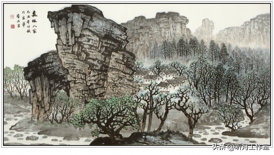 当代画家侯德昌《森林人家》纸本设色,纵97厘米横180厘米,2009年作。幅面宽广,构图别致。画家以细腻的笔触和丰富的色彩,生动描绘了森林深处的宁静人家,画面充满生机与和谐,展现出深厚的国画造诣。