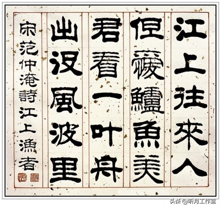 当代画家侯德昌《隶书江上渔者》纸本,隶书,纵68厘米横68厘米,2000年作。以纸本呈现,隶书风格独特。作品尺寸适中,构图均衡。书写范仲淹之诗,笔力雄健,字形端庄,展现出深厚的隶书功底。