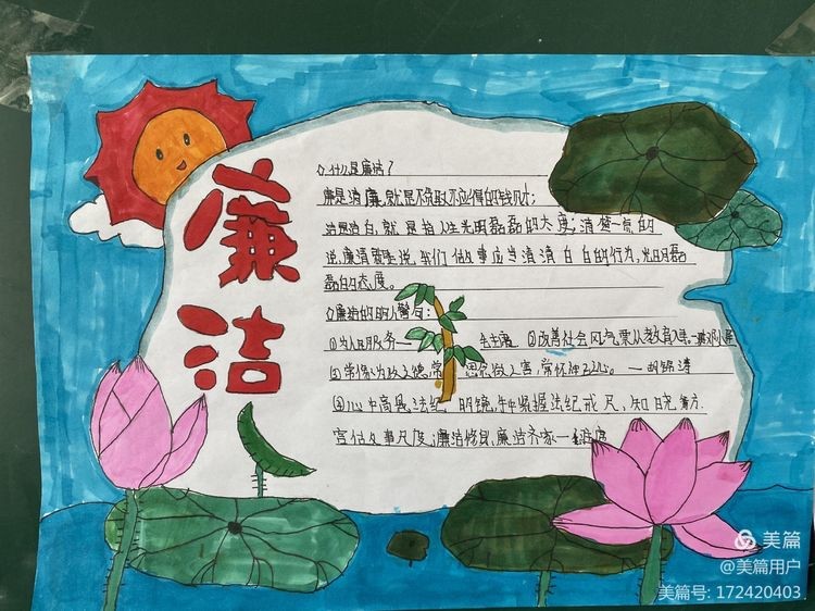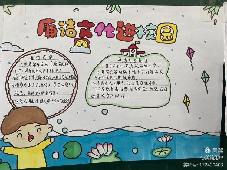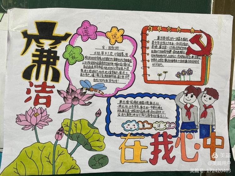 孩子们利用课后服务时间,在老师的指导下展开丰富的想象力,创作了一幅幅形式多样、寓意深刻、设计新颖、表现力强的倡廉手抄报作品,生动展示了反腐倡廉的内涵,同时在学生的心灵深处也种下了一颗廉洁的种子。