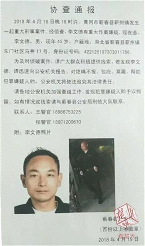 楚天都市报4月21日讯(记者梁传松)2018年4月18 日晚7时许,黄冈市蕲春县蕲州镇发生一起重大刑事案件。经侦查,蕲州镇45岁男子李某有重大作案嫌疑,记者了解到,20日晚,该男子被警方抓获。