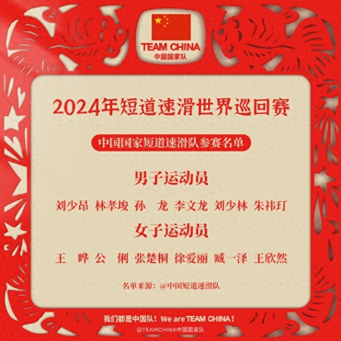 据“TEAMCHINA中国国家队”官方消息,中国短道速滑队公布了2024年短道速滑世界巡回赛参赛名单,刘少昂、刘少林、林孝埈领衔阵容。
