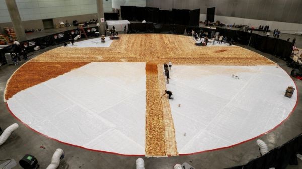 餐厅的厨师们在会议中心地板上制作比萨饼,完成后将其分成6.8万块出售。