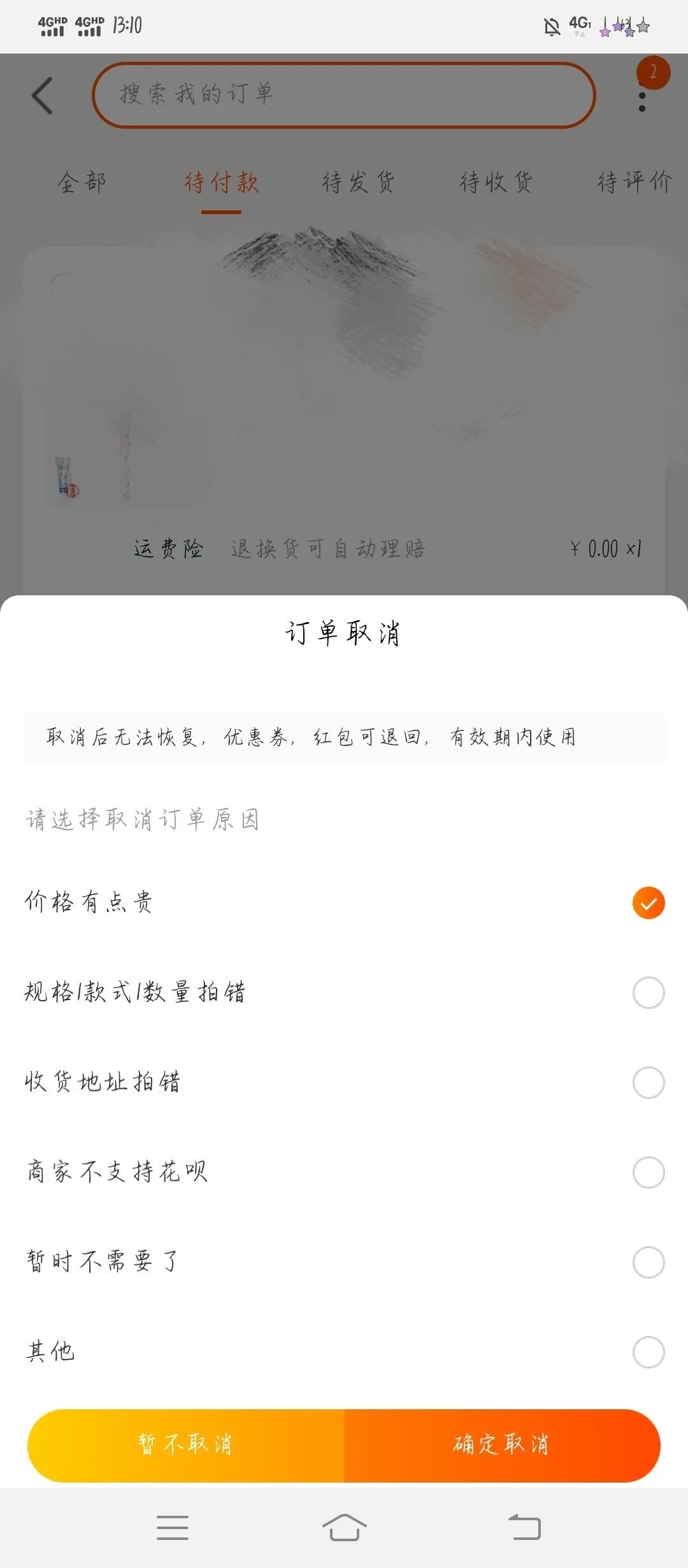 然后选择取消原因 点击右下角确定取消