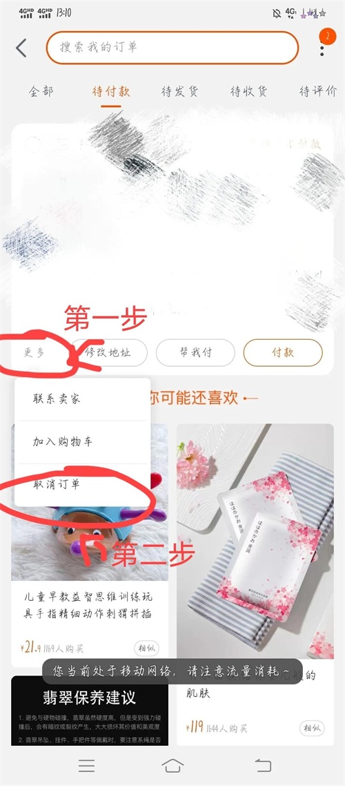 之后显示如下 第一步点击更多 第二步点击取消订单