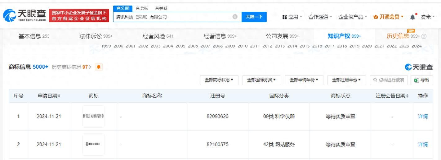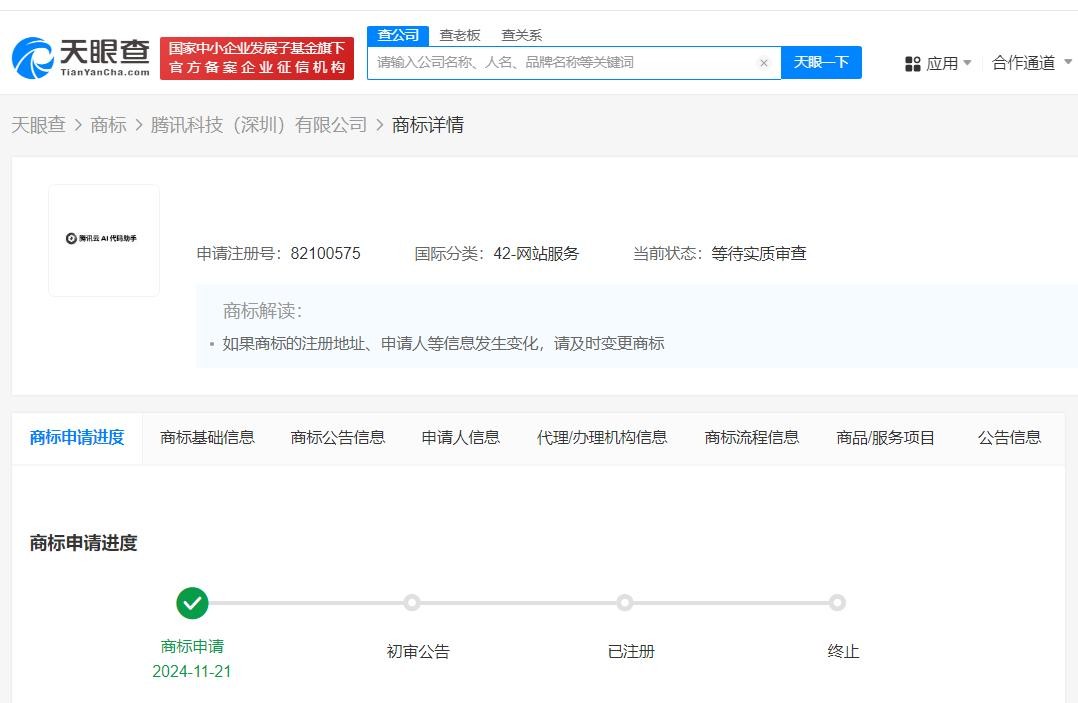 每经AI快讯,天眼查知识产权信息显示,近日,腾讯科技(深圳)有限公司申请注册两枚“腾讯云AI代码助手”商标,国际分类为科学仪器、网站服务,当前商标状态为等待实质审查。