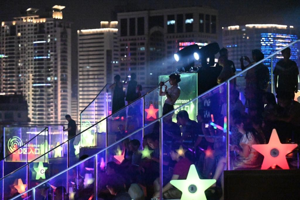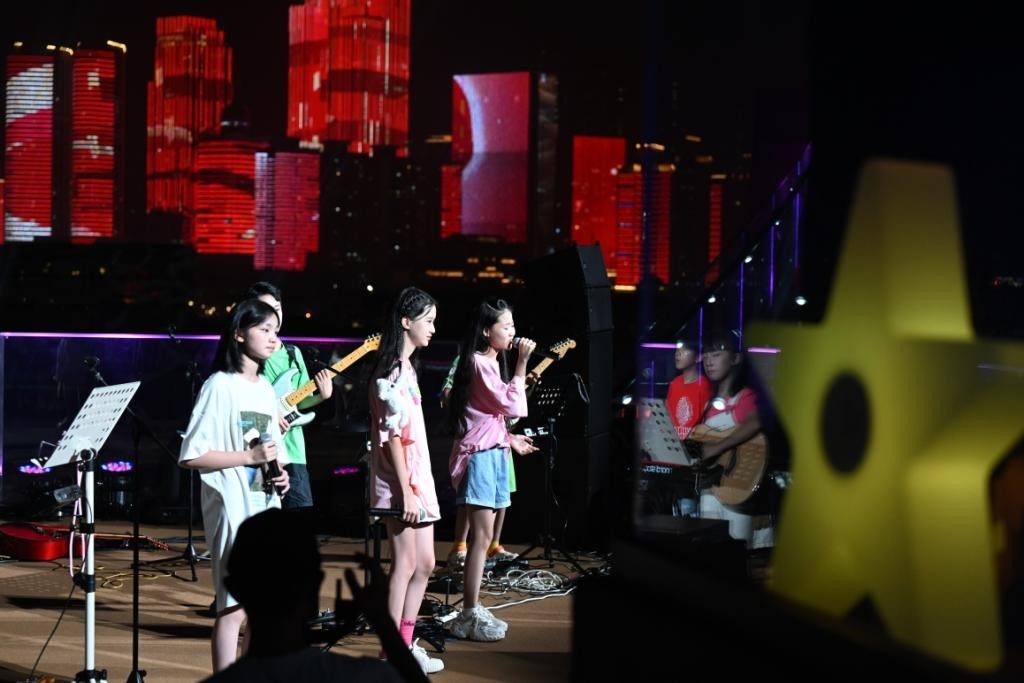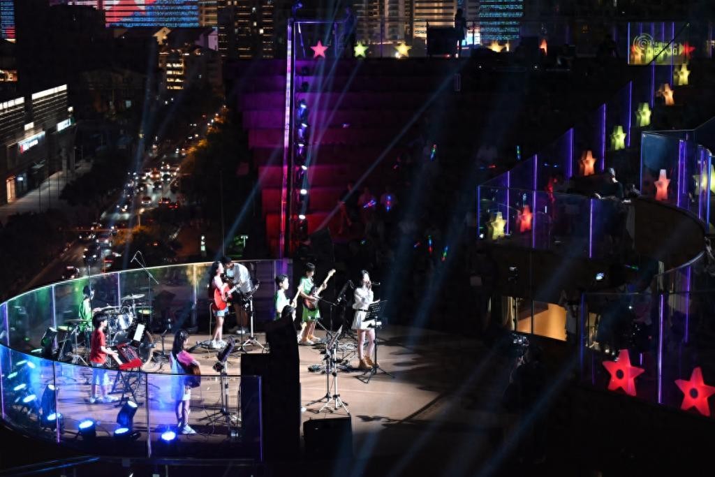 夜幕降临,浮山湾畔的海信广场Sky Bowl星光闪耀。舞台上,“小石头和孩子们”乐队欢快开唱,与慕名而来的市民游客共赴一场音乐的狂欢。