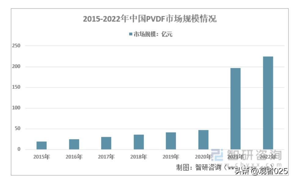 2021年、2022年以来受益于光伏、锂电池等领域需求快速放量,PVDF需求大幅增长,PVDF行业供需矛盾加剧。不同型号PVDF产品涨价出现分化,锂电粘结剂PVDF产品价格持续创造新高,需求与价格的增长共同拉动PVDF市场规模增长至196.52亿元。2022年,在光伏、锂电池领域PVDF等需求的拉动下,我国PVDF市场规模同比增长14.4%至224.84亿元。