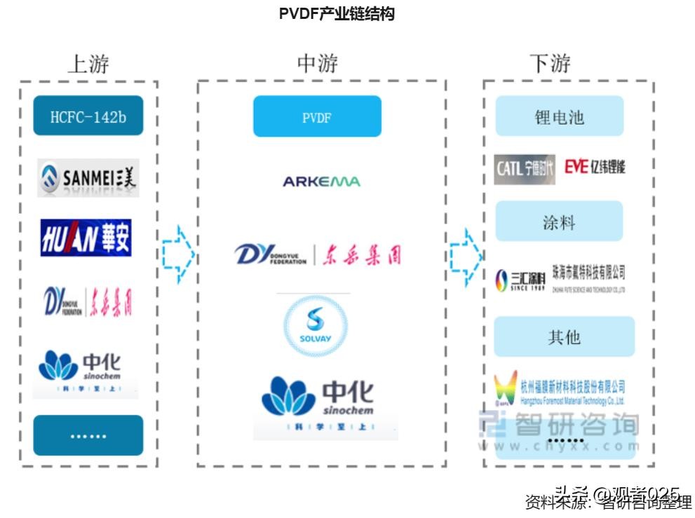 上游原材料主要为HCFC-142b,由于PVDF产业原料供给受配额限制,一般PVDF市场内资企业主要由具有HCFC-142b配额资格的企业延伸产业链生产PVDF产品,如东岳集团、中化蓝天等内资企业均采取此模式。