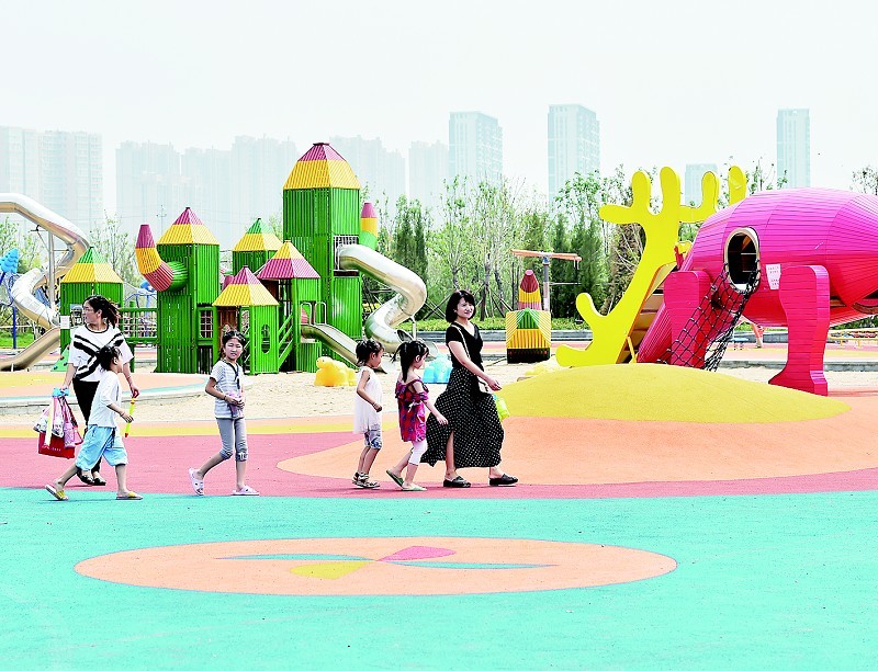 儿童活动区该景点位于北岸,占地面积1万余平方米。根据不同年龄段设置多处活动器械和活动空间。北侧5条不同构造的大型滑梯可满足各年龄段青少年的游玩需求;西侧设置儿童戏水区;周边布设小型儿童滑梯、滑索、秋千、爬网等游乐设施。此区域全部为无动力设施,地面全部铺设塑胶。