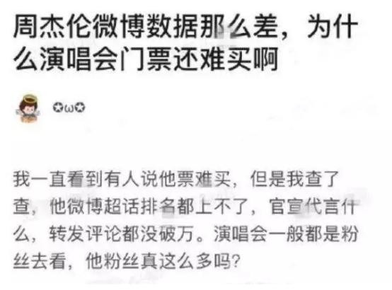 前几天,有个小朋友在豆瓣上提出了疑问:为什么周杰伦在微博数据如此差劲的情况下,演唱会依然一票难求呢?