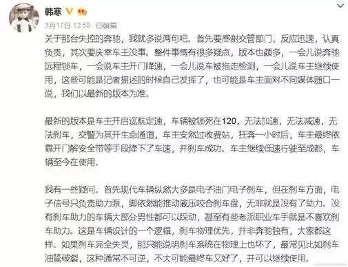 汽车圈众多大V认为“奔驰定速巡航失控”存在诸多疑点。比如专业赛车手、作家韩寒发微博称,“巡航可能真的一度取消不了,但车辆的速度是可控的,车主夸大和演绎了相当一部分内容”,并表示“我不会阴谋论车主的动机,一切以检测结果和交警的录像调查为准,如果错了,我愿意公开道歉。”