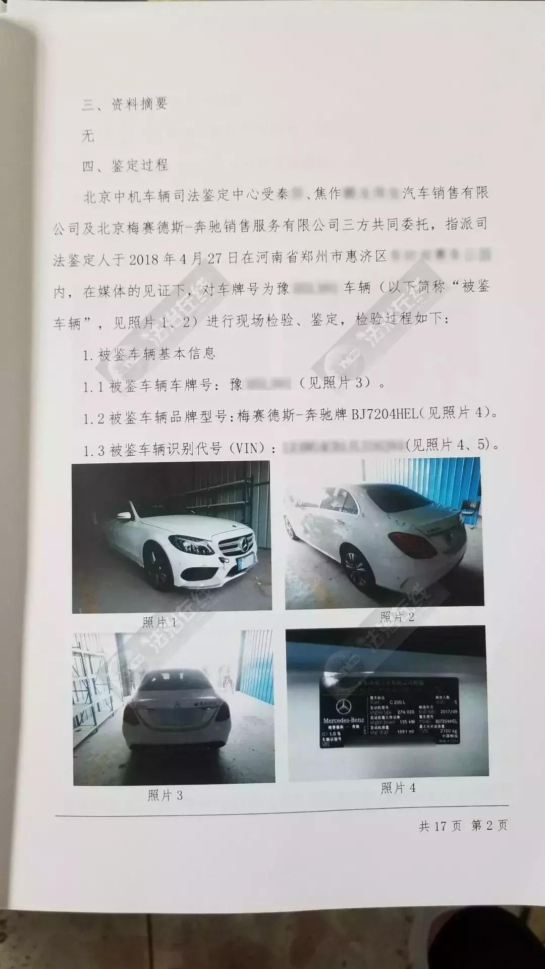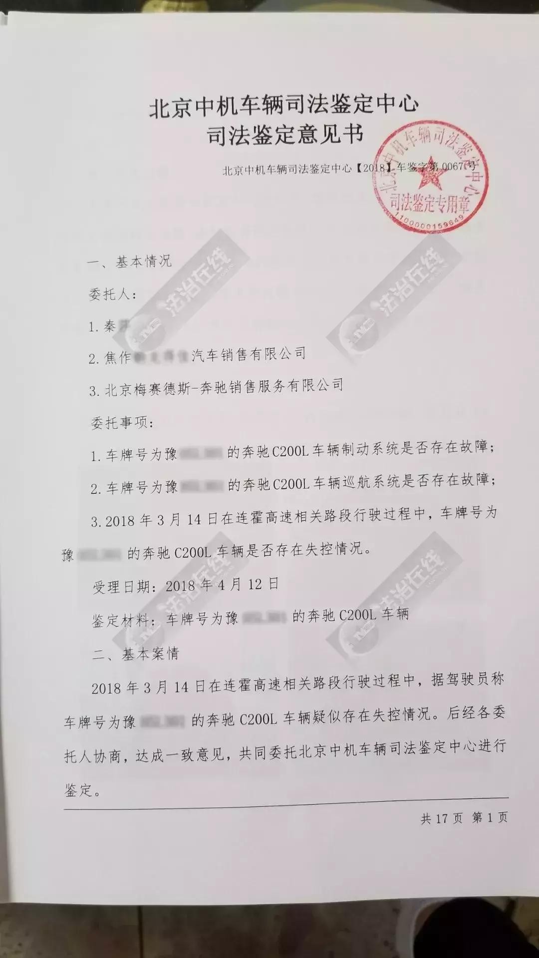据报道,2018年5月26日,也就是4月27日开始对车辆进行检测后一个月,奔驰车主薛先生收到了由检测机构北京中机车辆司法鉴定中心快递来的司法鉴定意见书。