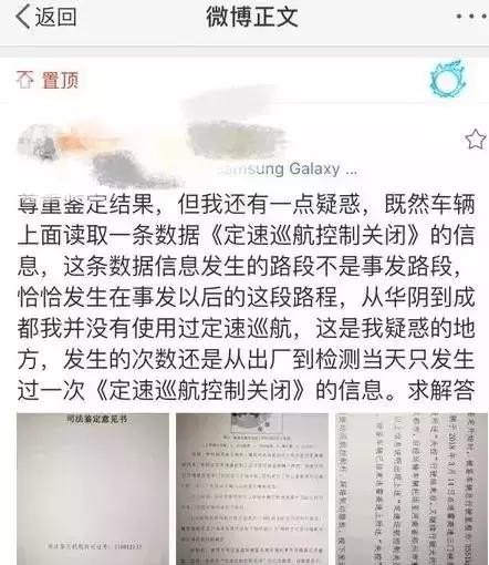 司法鉴定意见书显示,在车辆存储的事件存储器记录数据,发现了一条关于“定速巡航控制关闭”的记录数据,该数据显示,车辆在出厂后仅出现过一次“定速巡航控制关闭”,出现上述记录的车辆总行驶里程为3008km,而鉴定开始时,车辆总行驶里程3551km,车主事发后,从华阴收费站行驶大约800余公里到达成都,也就是说,出现“定速巡航控制关闭”的记录数据,是发生在事发后车主从华阴收费站到成都的路上。