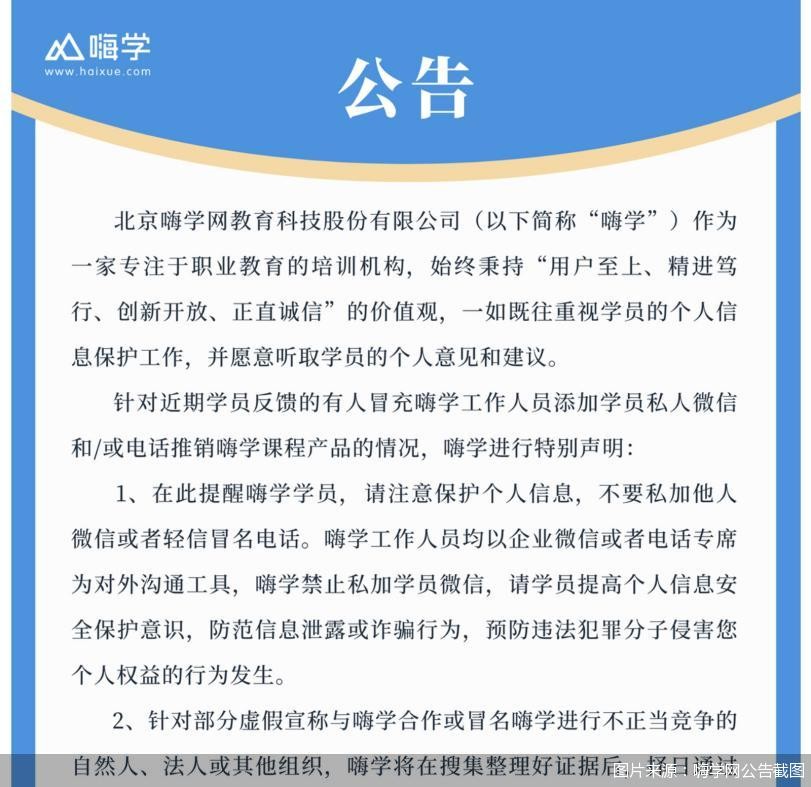 这两个细节为何值得关注?原因是在2024年9月14日嗨学网曾发布一则公告。公告称,近期学员反馈的有人冒充嗨学工作人员添加学员私人微信和/或电话推销嗨学课程产品的情况,嗨学进行特别声明:在此提醒嗨学学员,请注意保护个人信息,不要私加他人微信或者轻信冒名电话。嗨学工作人员均以企业微信或者电话专席为对外沟通工具,嗨学禁止私加学员微信,请学员提高个人信息安全保护意识,防范信息泄露或诈骗行为,预防违法犯罪分子侵害您个人权益的行为发生。