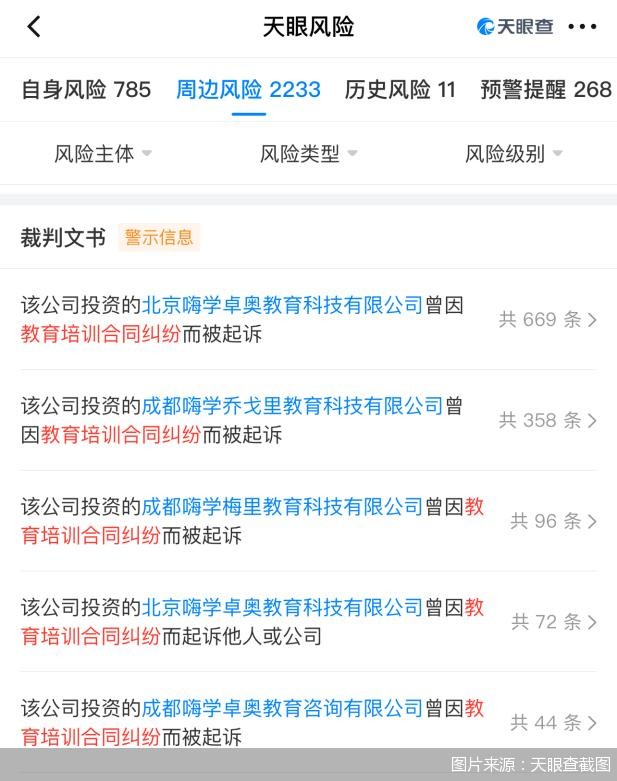 天眼查信息则显示,有大量嗨学网及其100%投资或控制的公司,曾因教育培训合同纠纷而被起诉的裁判文书信息。截至2025年3月13日,嗨学网有431条,北京嗨学卓奥有669条,成都嗨学乔戈里有358条,成都嗨学梅里教育科技有限公司有96条。